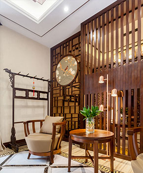 中式屏風做成的護墻與中式刺繡搭配餐廳門框處采用的中式花格隔斷地下一樓客廳書房處用書法所做的背景墻書房全景二樓房間房間內一角地下一樓客廳